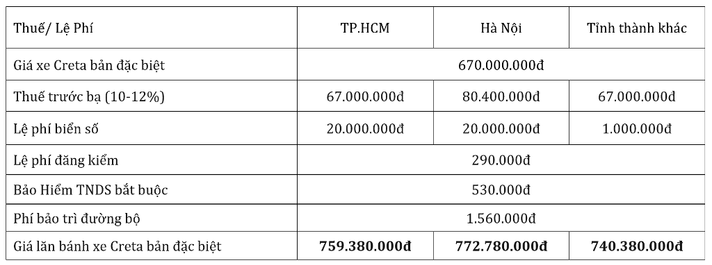 Hyundai Creta 2025 là một mẫu SUV hấp dẫn với nhiều phiên bản và mức giá đa dạng. Giá niêm yết của phiên bản Tiêu chuẩn là 599 triệu VNĐ, trong khi phiên bản Đặc biệt có giá 659 triệu VNĐ. Đặc biệt, nếu bạn xem xét giá lăn bánh tại các thành phố lớn như Hà Nội, TP.HCM và Hà Tĩnh, mức phí này cũng có sự chênh lệch đáng kể.