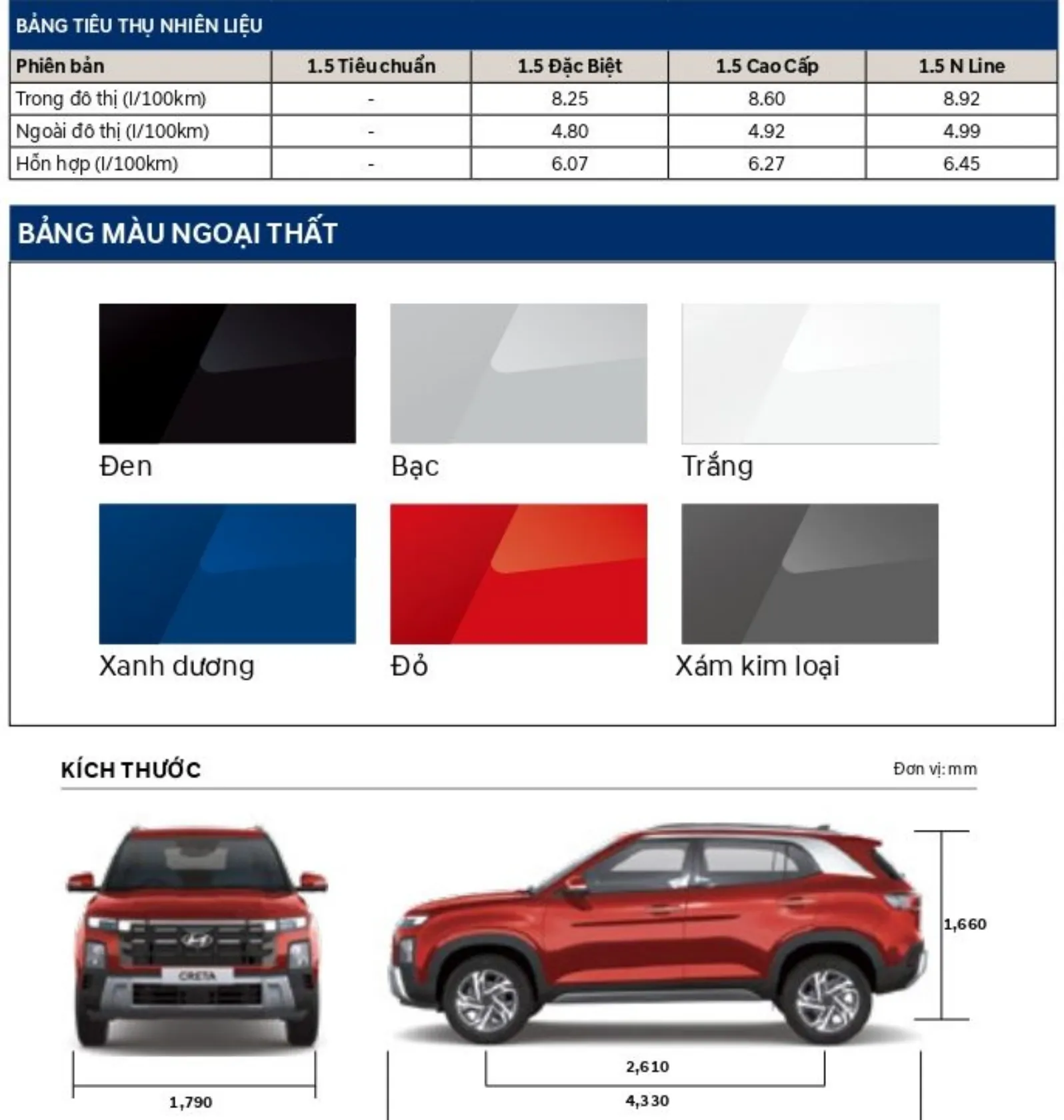 Ngoài ra, các phiên bản cao cấp hơn như 1.5L Đặc biệt và 1.5L Cao cấp cũng rất đáng chú ý với các mức giá lăn bánh lần lượt khoảng 740 triệu VNĐ và 800 triệu VNĐ. Điều này khiến Hyundai Creta trở thành một lựa chọn hấp dẫn trong phân khúc SUV hạng B, với thiết kế hiện đại và đầy đủ tính năng.