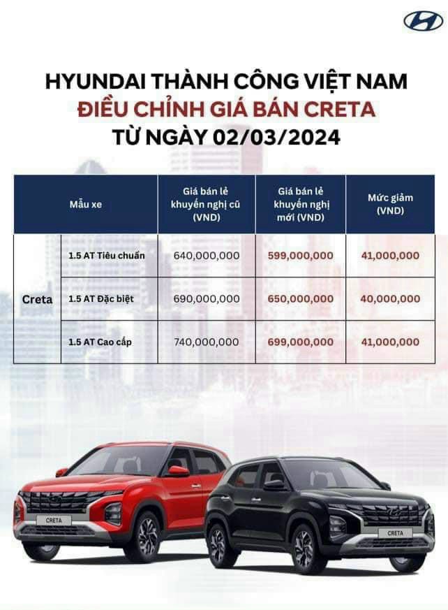 Tháng 12/2025, chương trình khuyến mãi dành cho Hyundai Creta đang mang đến cơ hội tuyệt vời cho những ai đang tìm kiếm một chiếc xe mới. Với mức giảm giá lên tới 50 triệu đồng từ nhà phân phối chính hãng, bạn có thể sở hữu một chiếc Creta mới với giá chỉ từ 590 triệu đồng cho phiên bản Tiêu chuẩn.