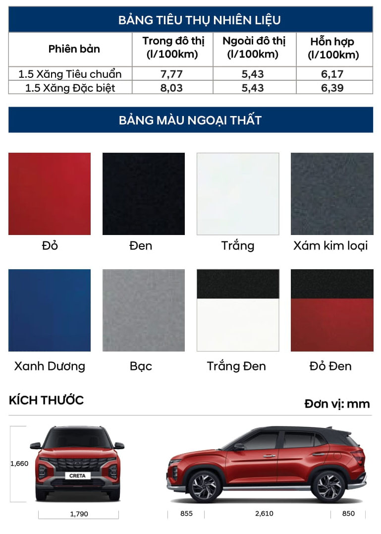 Hyundai Creta là mẫu SUV đô thị cỡ B đang nhận được nhiều sự quan tâm từ người tiêu dùng Việt Nam nhờ thiết kế hiện đại, nhiều tiện nghi và mức giá cạnh tranh. Trong bài viết này, chúng tôi sẽ cập nhật bảng giá mới nhất, chi tiết giá lăn bánh, thông số kỹ thuật cùng đánh giá ưu nhược điểm của Hyundai Creta. Bên cạnh đó, bài viết còn tổng hợp các chương trình khuyến mãi, lựa chọn màu sắc, so sánh với các đối thủ cùng phân khúc, cũng như thông tin mua xe trả góp, đại lý chính hãng và hình ảnh nội thất – ngoại thất của Hyundai Creta để khách hàng dễ dàng tham khảo trước khi lựa chọn.