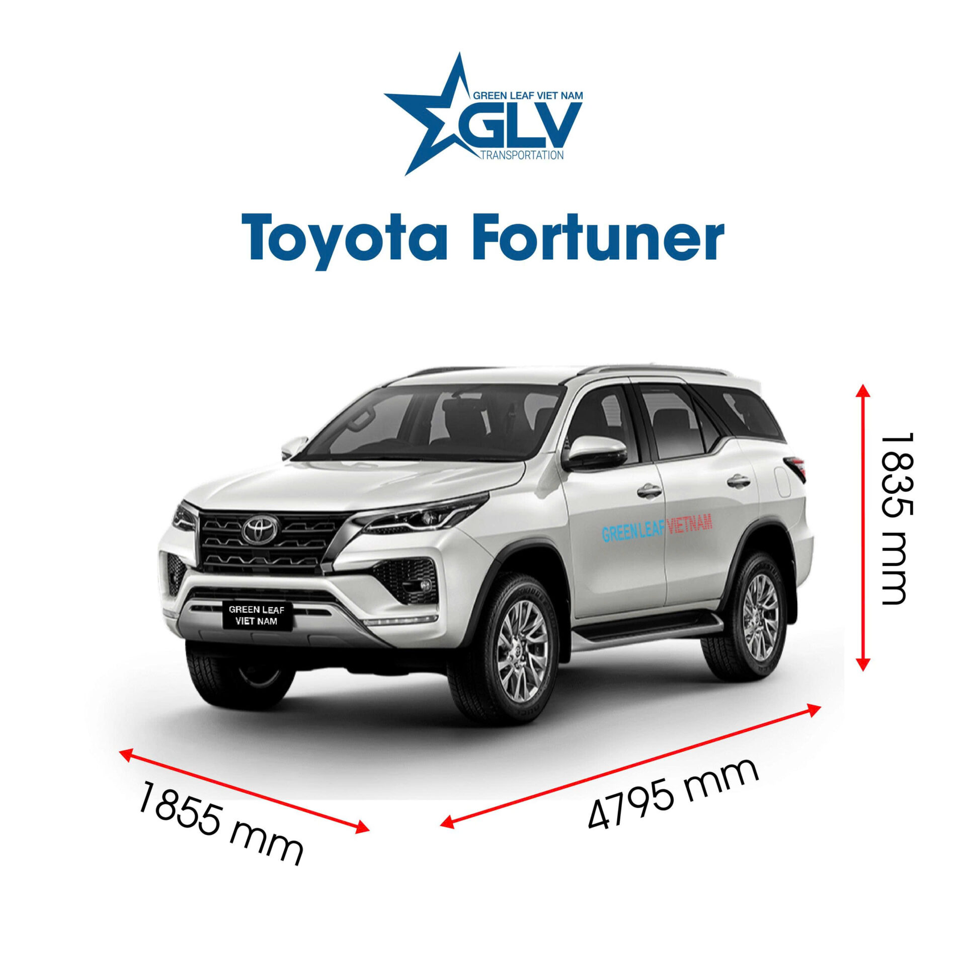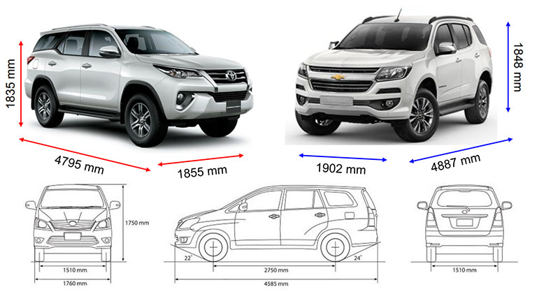 Trong số đó, Toyota Fortuner nổi bật là mẫu SUV 7 chỗ tầm trung với kích thước 4.795 x 1.855 x 1.835 mm, chiều dài cơ sở 2.745 mm. Xe còn được phân chia thành các hạng khác nhau. Hạng A có kích thước từ 4.600 x 1.700 x 1.750 mm đến 4.700 x 1.750 x 1.750 mm, trong khi hạng B là từ 4.700 x 1.760 x 1.750 mm đến 4.850 x 1.750 x 1.850 mm.