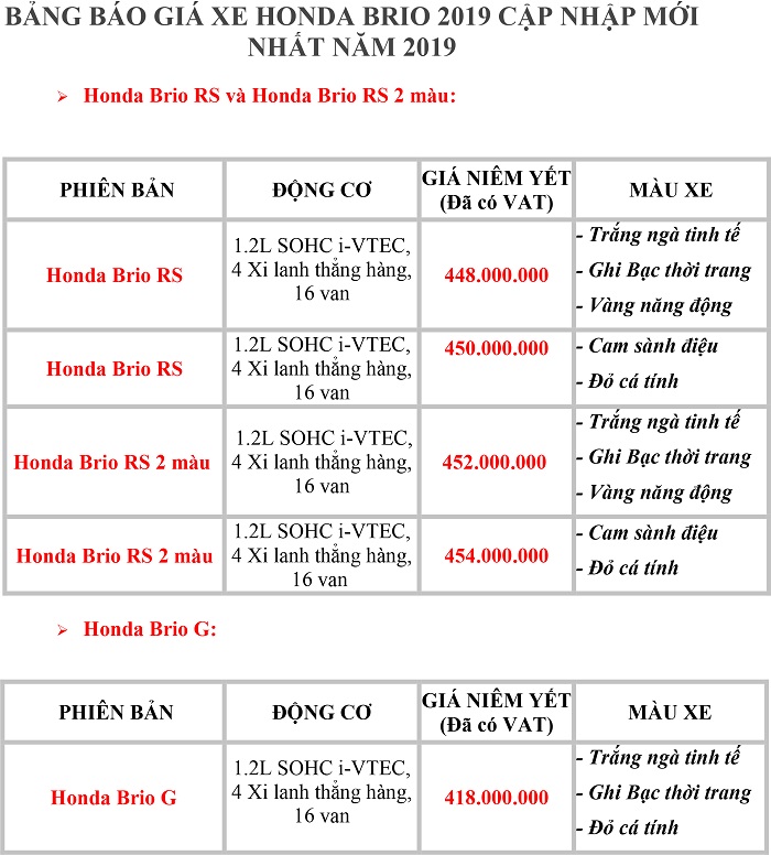 Mẫu xe này có nhiều phiên bản khác nhau với giá niêm yết rất hợp lý. Cụ thể, phiên bản Brio G (có các màu trắng ngà, ghi bạc, đỏ) có giá 418 triệu đồng, trong khi phiên bản Brio RS (trắng ngà, ghi bạc, vàng) có giá 448 triệu đồng. Đặc biệt, phiên bản Brio RS OP1 với nóc sơn đen được công bố giá 452 triệu đồng, đem đến sự năng động và cá tính hơn cho người sử dụng.