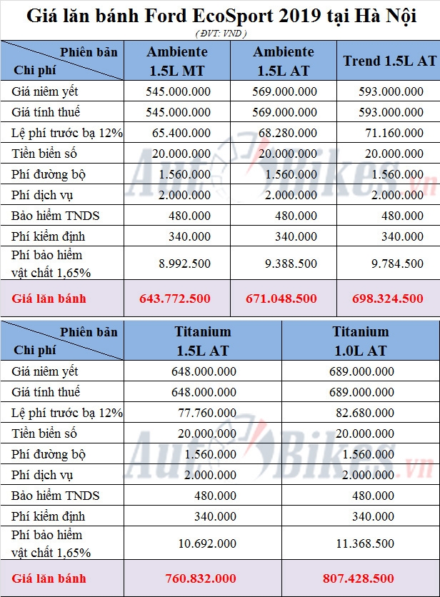 Đối với phiên bản 1.0L Ecoboost, giá lăn bánh cũng không kém phần hấp dẫn, khoảng 689 triệu VNĐ đến 799 triệu VNĐ, mang lại cho người dùng nhiều lựa chọn thú vị. Sau khi tính toán chi phí thuế, phí, giá lăn bánh tổng cộng của Ford EcoSport 2019 dao động từ 624 triệu đến 807 triệu VNĐ, sẽ có sự chênh lệch nhẹ theo từng vùng miền.