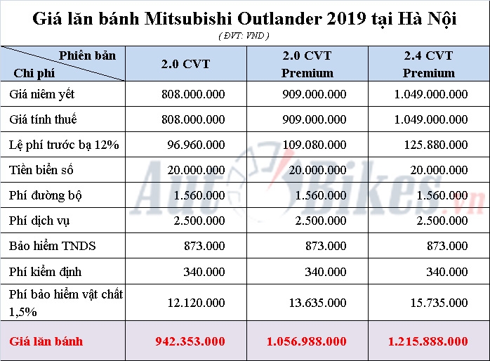 Tính tổng tất cả các khoản thuế và phí, chi phí lăn bánh cho phiên bản 2.0 CVT Premium sẽ rơi vào khoảng 955 triệu đồng. Như vậy, khi đã xác định sở hữu một chiếc Outlander, bạn cũng nên cân nhắc kỹ các khoản chi phí đó để có sự chuẩn bị tốt nhất!