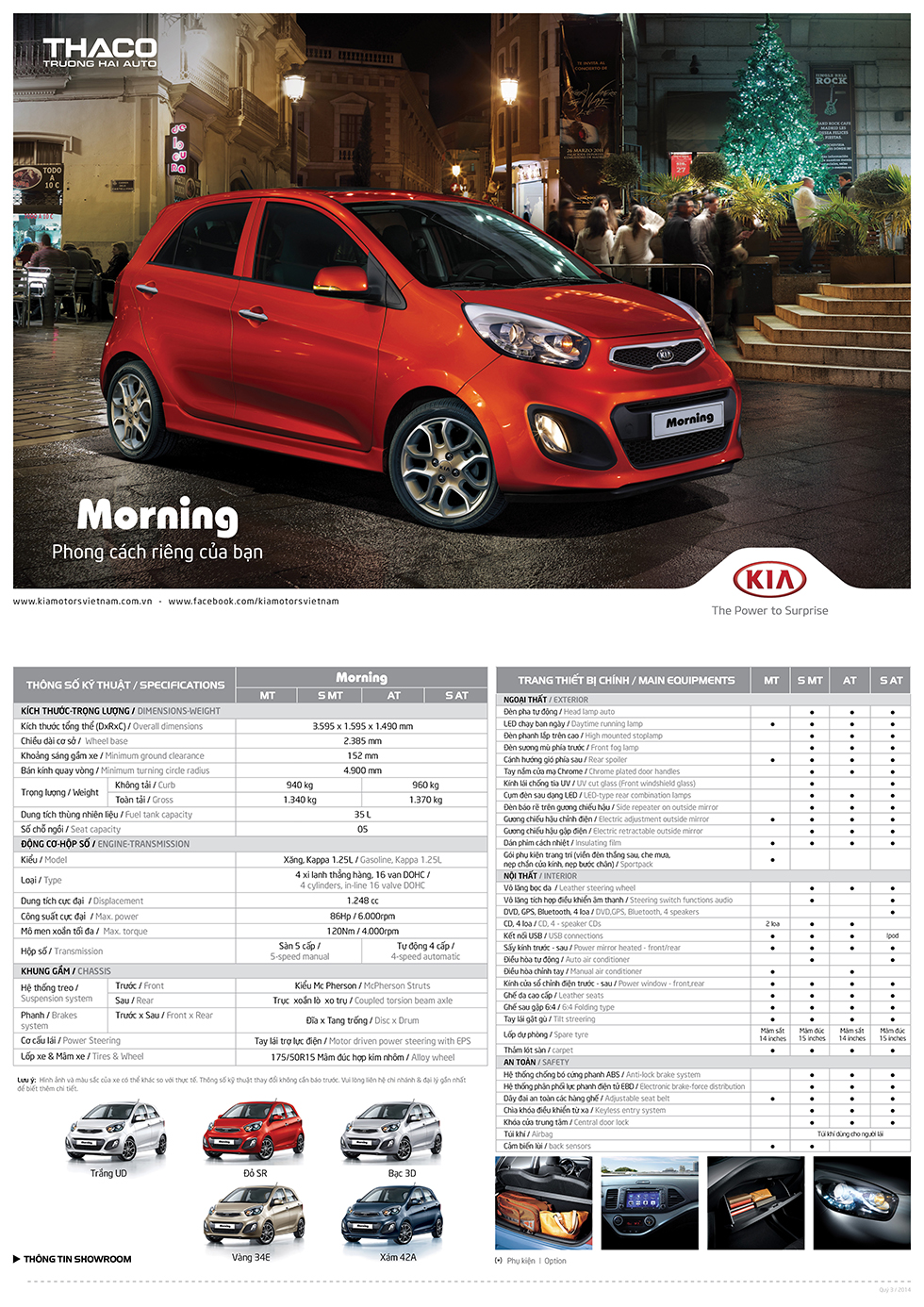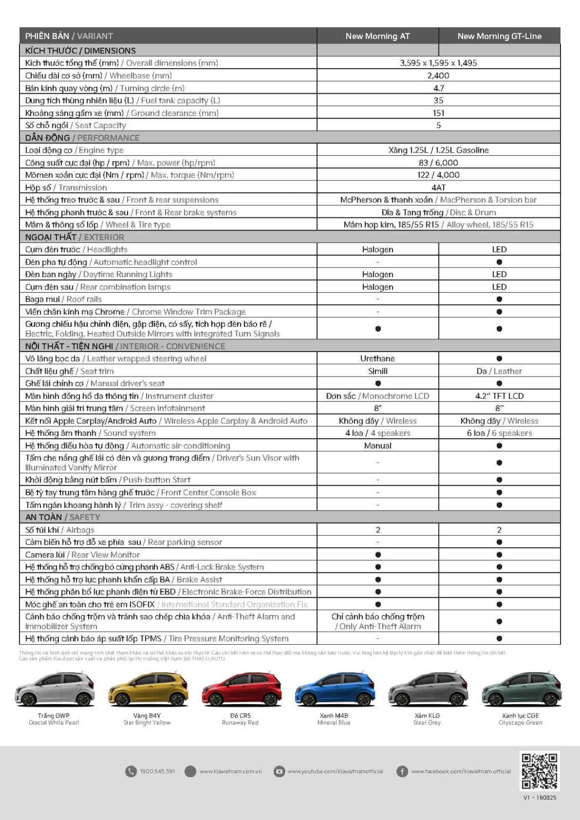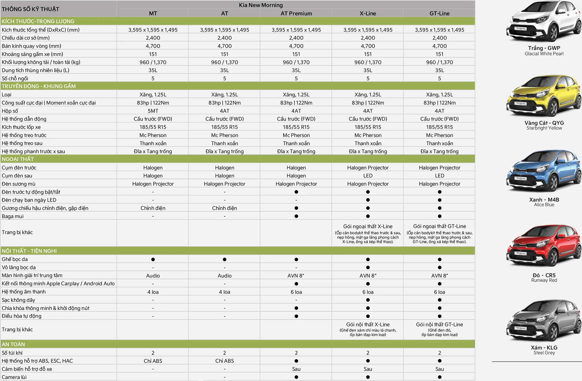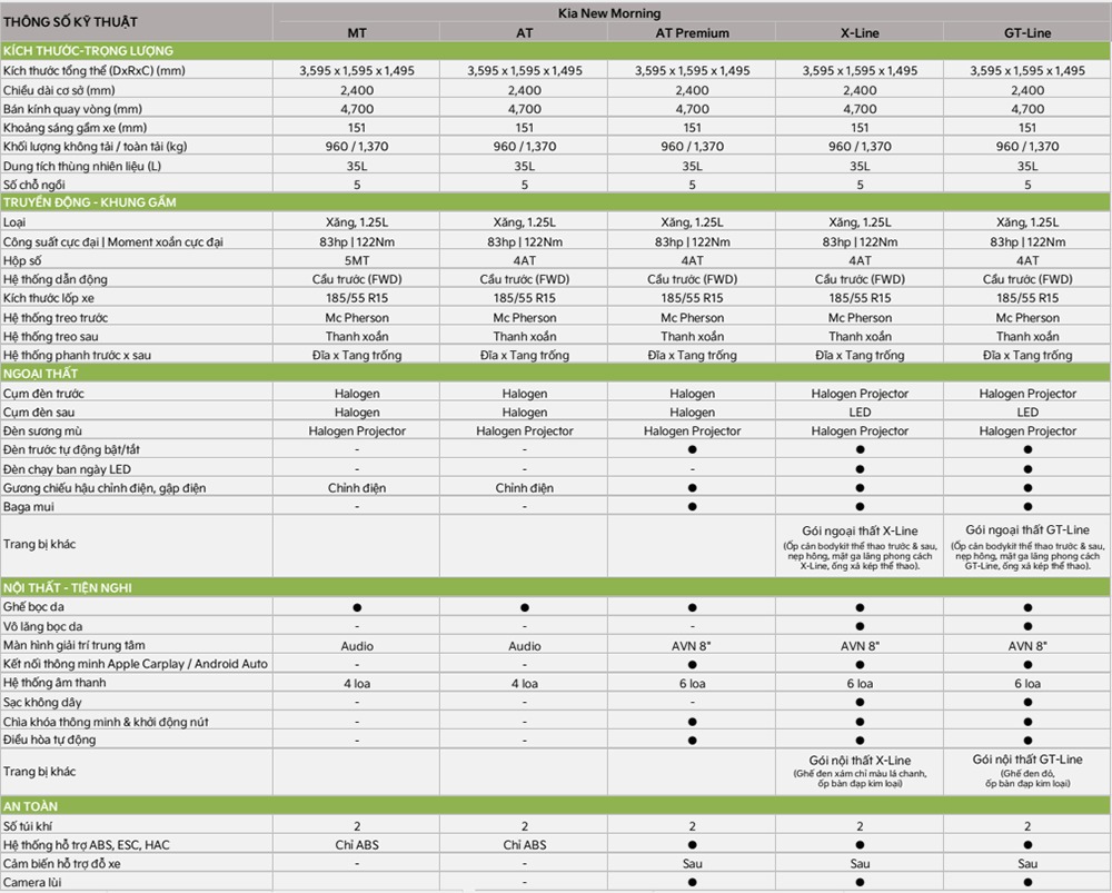 Kia Morning là một trong những mẫu xe đô thị được ưa chuộng tại Việt Nam nhờ sự kết hợp hoàn hảo giữa thiết kế hiện đại, tiết kiệm nhiên liệu và tính năng vận hành ổn định. Với những thông số kỹ thuật nổi bật như động cơ mạnh mẽ, khả năng tiết kiệm nhiên liệu vượt trội và các tính năng an toàn hiện đại, Kia Morning không chỉ đáp ứng nhu cầu di chuyển hàng ngày mà còn mang lại trải nghiệm lái xe thú vị. Sự linh hoạt và tiện nghi của mẫu xe này chắc chắn sẽ làm hài lòng những người tiêu dùng yêu thích sự trẻ trung, năng động trong cuộc sống đô thị.