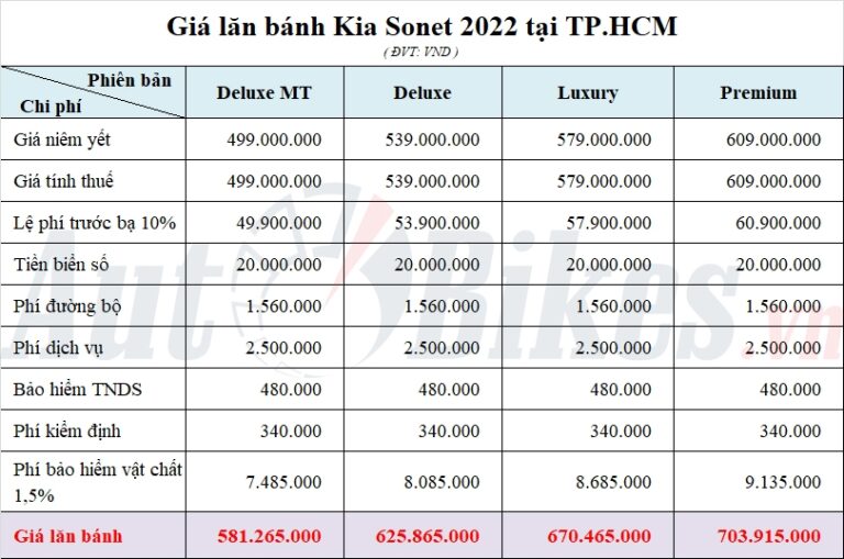 Tại TP.HCM, giá lăn bánh của Kia Sonet có sự chênh lệch đôi chút, ví dụ như phiên bản 1.5 Deluxe có giá lăn bánh khoảng 571 triệu đồng. Ngoài ra, người tiêu dùng còn được hưởng nhiều ưu đãi hấp dẫn như giảm giá tiền mặt lên tới 30 triệu đồng và tặng gói phụ kiện chính hãng KIA, làm tăng thêm sức hấp dẫn cho mẫu xe này.