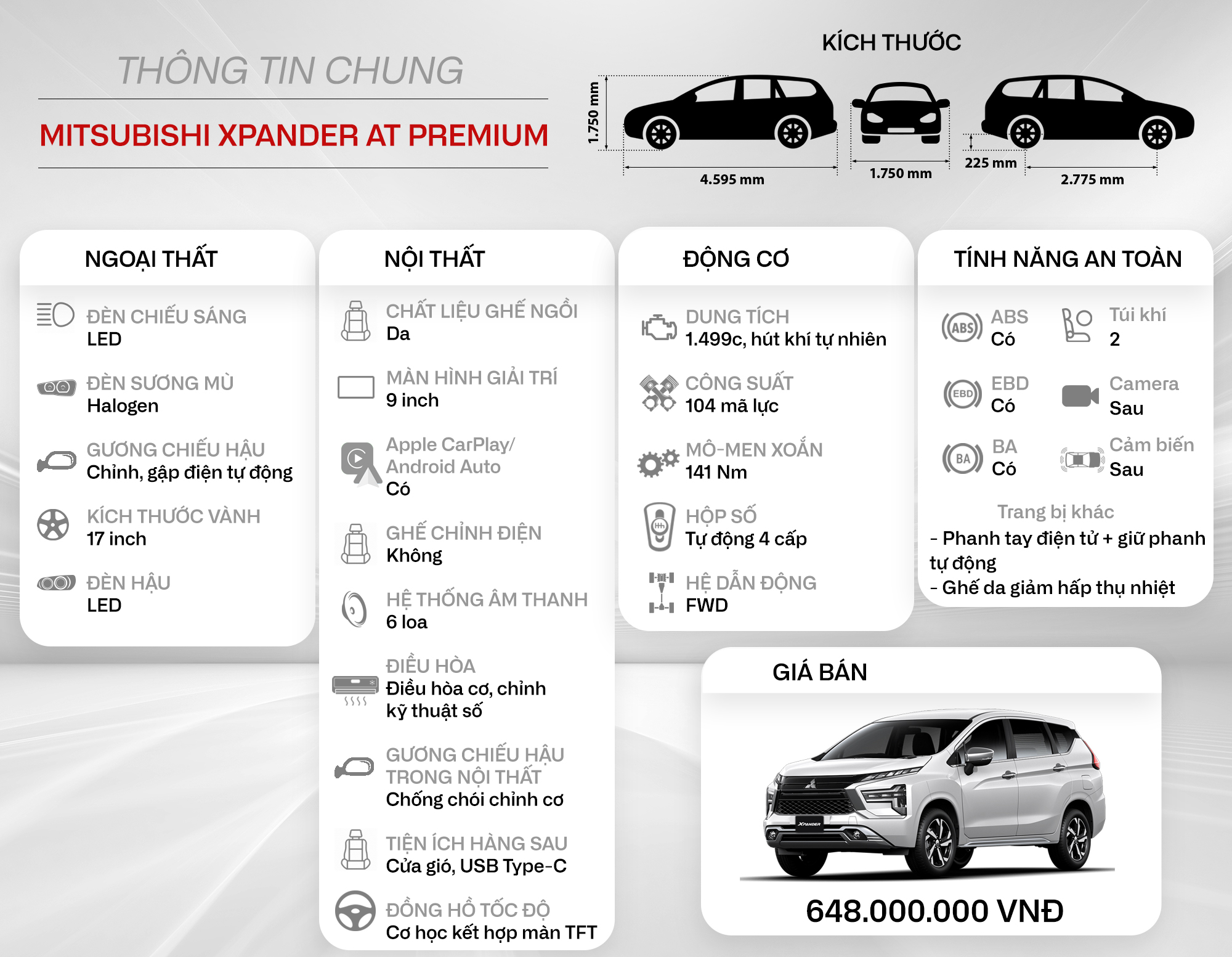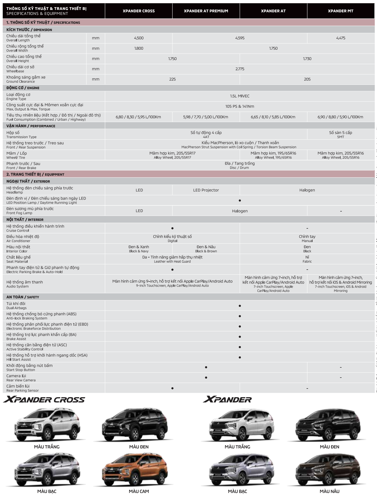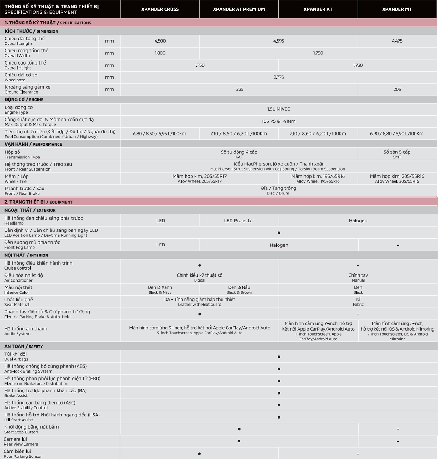 Mitsubishi Xpander hiện đang là mẫu MPV được ưa chuộng hàng đầu trên thị trường Việt Nam nhờ thiết kế hiện đại, đa dụng cùng mức giá hấp dẫn. Với mong muốn đem đến cho khách hàng cái nhìn tổng quan và chi tiết nhất về mẫu xe này, bài viết dưới đây sẽ tổng hợp đầy đủ các thông số kỹ thuật, kích thước, động cơ, công suất vận hành, mức tiêu thụ nhiên liệu, trang bị nội ngoại thất, trang bị an toàn, tiện nghi, lốp xe và khoang hành lý của Mitsubishi Xpander. Qua đó, bạn sẽ có thêm thông tin hữu ích để lựa chọn phiên bản phù hợp với nhu cầu sử dụng của mình.