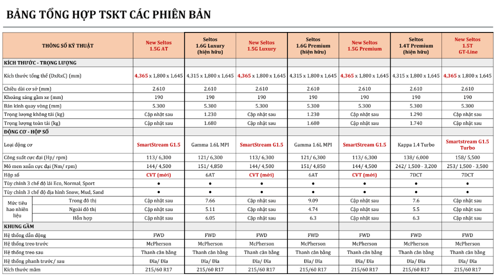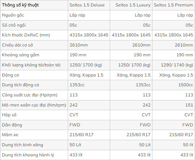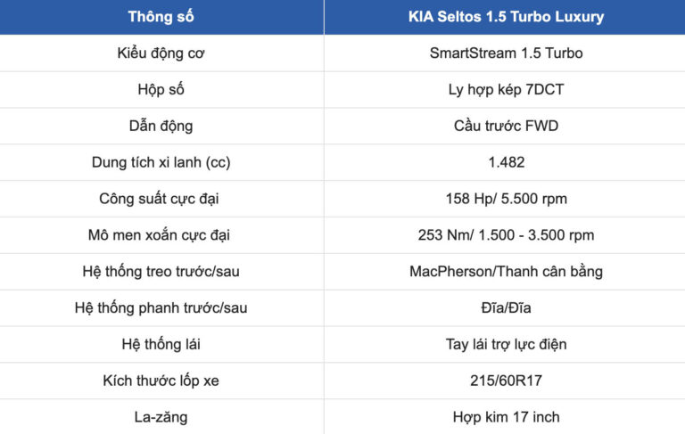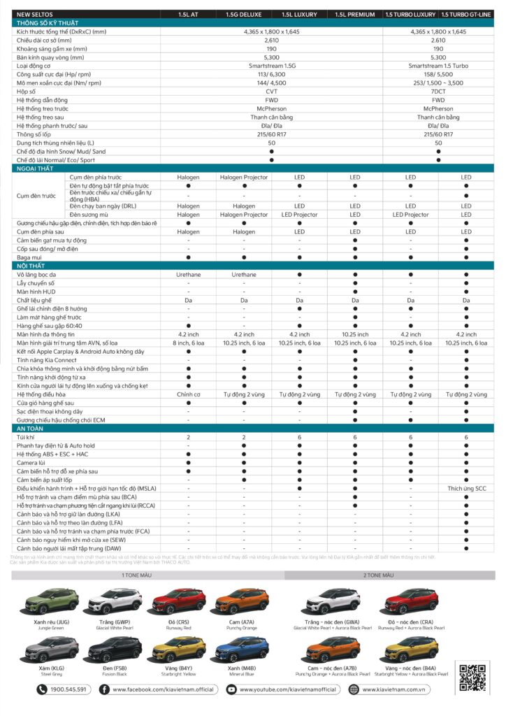 Kia Seltos là mẫu SUV đô thị nổi bật của thương hiệu Kia, thu hút sự quan tâm của đông đảo khách hàng nhờ thiết kế hiện đại, nhiều trang bị tiện nghi cùng khả năng vận hành mạnh mẽ. Bài viết dưới đây sẽ cung cấp thông tin chi tiết về các thông số kỹ thuật, động cơ, kích thước, màu sắc, cũng như những trang bị an toàn, tiện nghi của Kia Seltos. Ngoài ra, bài viết còn đề cập đến dung tích bình nhiên liệu, khoang hành lý, khoảng sáng gầm xe và mức tiêu thụ nhiên liệu, giúp bạn đọc có cái nhìn tổng quan nhất về mẫu xe này.