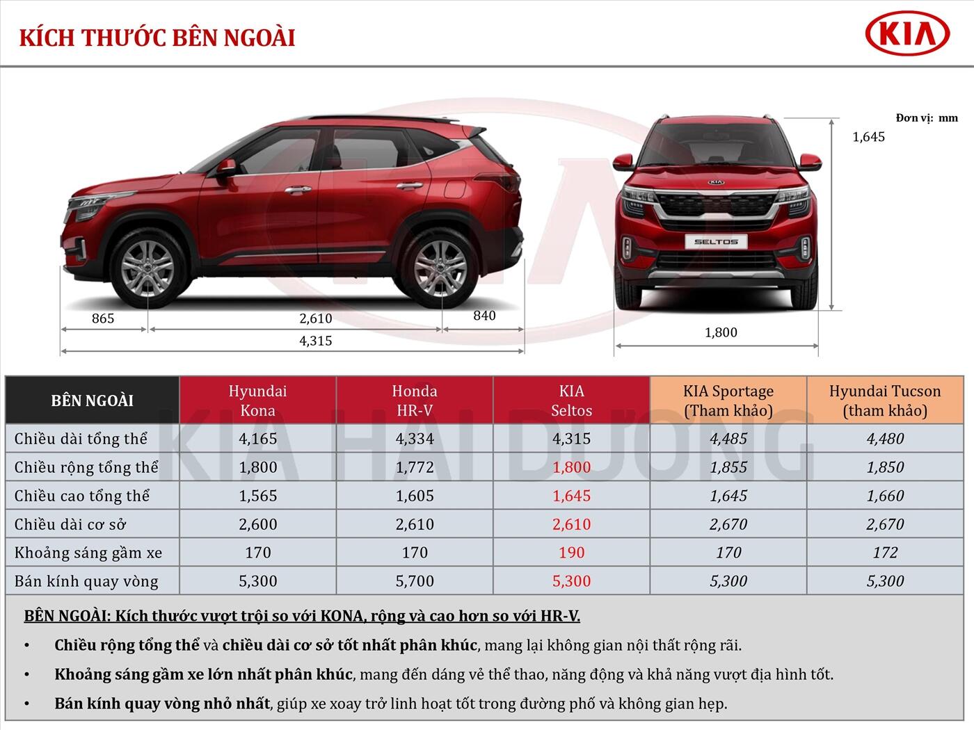 Kia Seltos là một trong những mẫu SUV nổi bật với kích thước tổng thể khá lý tưởng: dài 4.365 mm, rộng 1.800 mm và cao 1.645 mm. Trục cơ sở 2.610 mm cùng khoảng sáng gầm lên đến 190 mm mang lại không gian nội thất thoải mái và khả năng vượt địa hình tốt.