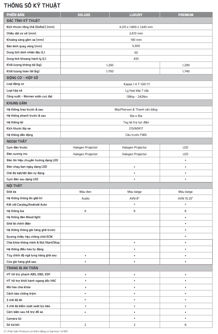 Xe được trang bị động cơ SmartStream 1.5L, cho công suất tối đa 113 mã lực ở vòng tua 6.300 vòng/phút, đi kèm với mô-men xoắn ấn tượng. Đặc biệt, phiên bản 1.4 Turbo còn nâng công suất lên 138 mã lực với mô-men xoắn cực đại lên tới 242 Nm, kết hợp với hộp số ly hợp kép 7 cấp giúp tăng trải nghiệm lái.