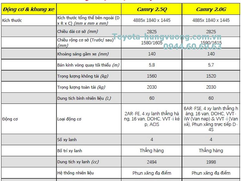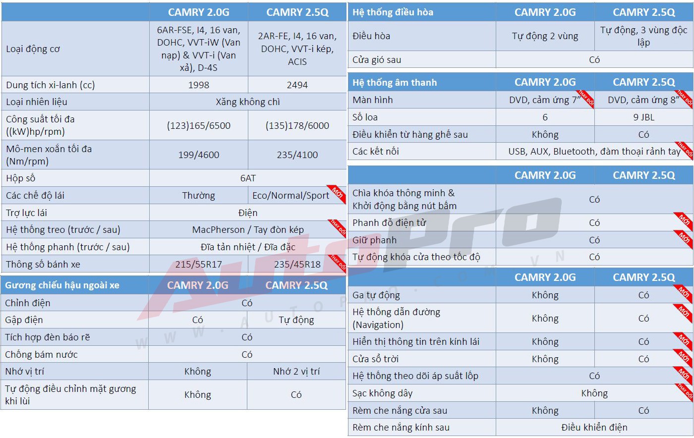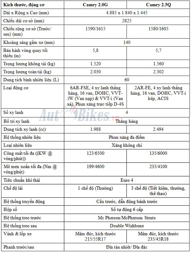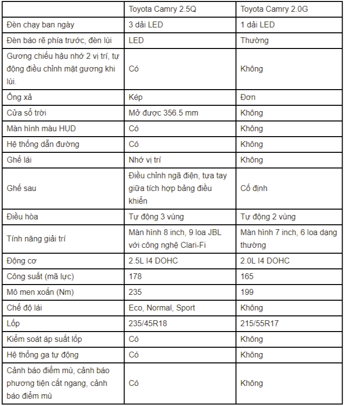 Trong khi đó, phiên bản 2.5Q cao cấp với động cơ 2.5L có công suất lên tới 178 mã lực và mô-men xoắn 235 Nm, mang lại cảm giác lái mạnh mẽ hơn. Đặc biệt, động cơ này còn được trang bị hộp số tự động 6 cấp, giúp chuyển số mượt mà và tiết kiệm nhiên liệu hơn. Tỉ lệ trọng lượng/công suất của Camry 2.5Q là 8,62 kg/mã lực, cho thấy khả năng tăng tốc nhanh và hiệu suất vượt trội.