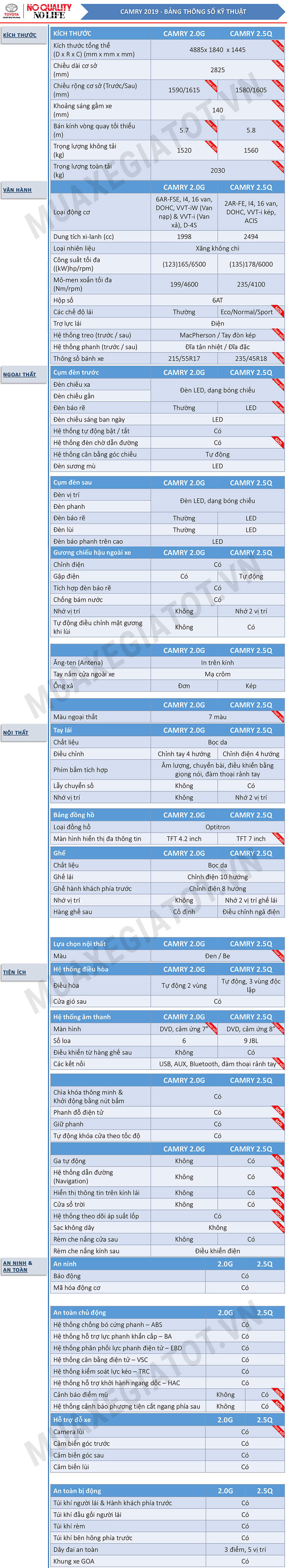 Trên đây là những thông số kỹ thuật nổi bật của Toyota Camry 2019, khẳng định vị thế của mẫu xe này trên thị trường ô tô hiện đại. Với thiết kế sang trọng, động cơ mạnh mẽ cùng nhiều tính năng hiện đại, Camry 2019 không chỉ đáp ứng tốt nhu cầu di chuyển mà còn mang lại trải nghiệm lái xe thú vị. Khả năng tiết kiệm nhiên liệu và độ an toàn cao cũng là những điểm cộng lớn cho mẫu xe này. Chắc chắn rằng Toyota Camry 2019 sẽ tiếp tục chinh phục trái tim của nhiều khách hàng trong thời gian tới.