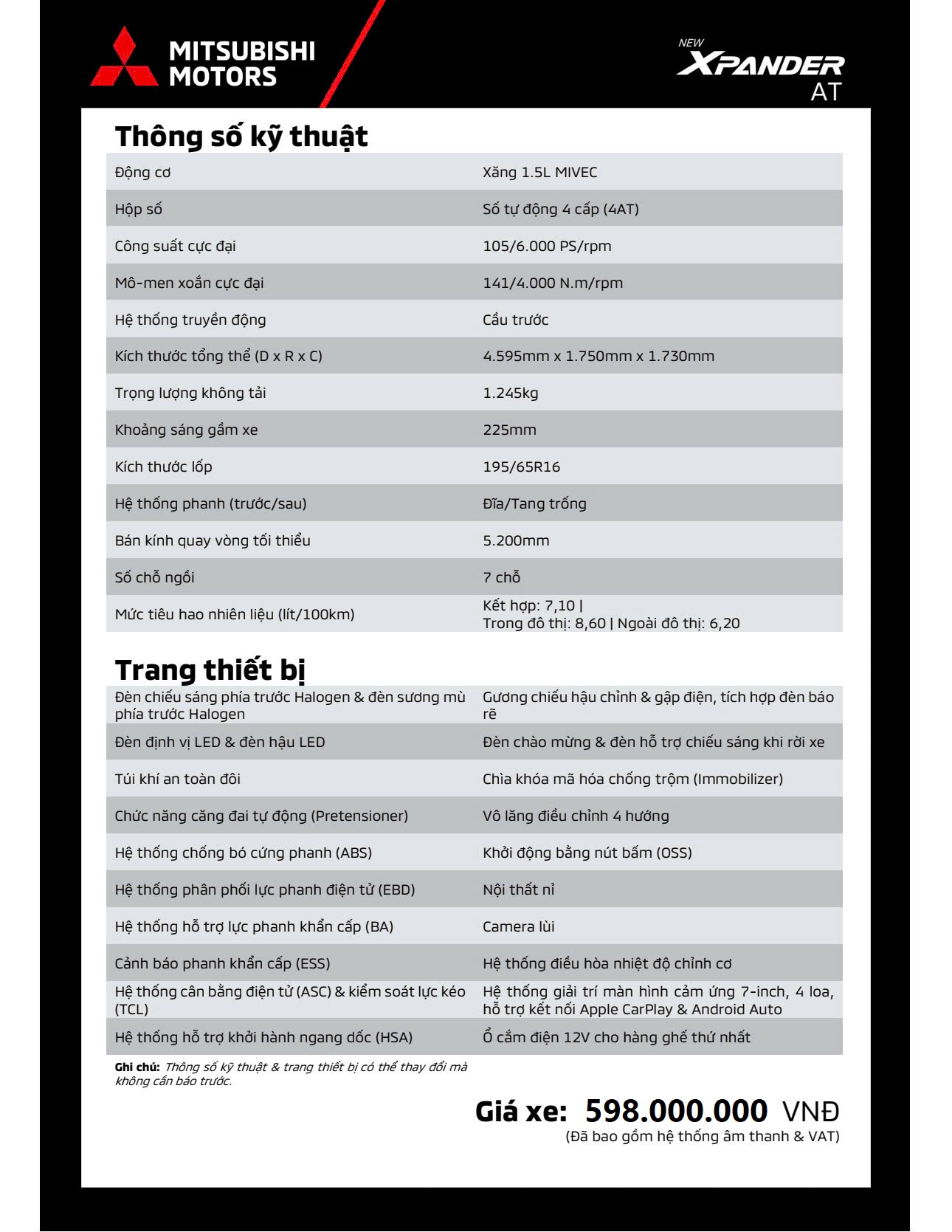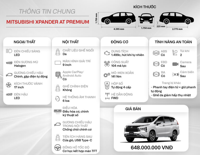 Mitsubishi Xpander 2022 là một trong những dòng xe MPV nổi bật tại thị trường Việt Nam, chinh phục người dùng nhờ thiết kế hiện đại, khả năng vận hành ổn định cùng loạt trang bị tiện nghi tiên tiến. Với nhiều cải tiến về động cơ, an toàn, nội và ngoại thất, Xpander 2022 đáp ứng đa dạng nhu cầu sử dụng từ gia đình đến doanh nghiệp. Bài viết dưới đây sẽ tổng hợp đầy đủ những thông tin quan trọng về thông số kỹ thuật, động cơ, kích thước, trang bị an toàn, nội thất, ngoại thất, tiện nghi, hệ dẫn động, mức tiêu thụ nhiên liệu và hệ thống giải trí của Mitsubishi Xpander 2022.