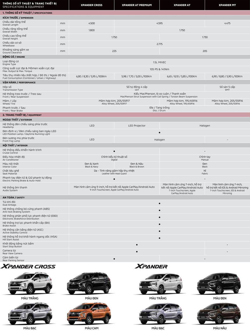 Kích thước tổng thể của Xpander 2022 cũng được cải thiện, với chiều dài 4.595 mm, rộng 1.750 mm và cao 1.750 mm, mang lại không gian rộng rãi cho 7 chỗ ngồi. Với 4 màu sắc nổi bật cho phiên bản đặc biệt như bạc, đen, nâu, và trắng, cũng như các màu thể thao dành riêng cho phiên bản Cross như cam và xanh, người dùng có thêm sự lựa chọn phù hợp với phong cách cá nhân.