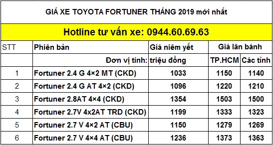 Toyota Fortuner 2019 đã trở thành một trong những mẫu xe SUV được ưa chuộng nhất tại Việt Nam. Hiện tại, hãng Toyota phân phối đến 6 phiên bản của mẫu xe này, với giá khởi điểm từ 1,033 tỷ đến 1,354 tỷ đồng. Các phiên bản này bao gồm hai loại máy dầu 2.8L, 2.4L và một loại máy xăng 2.7L.