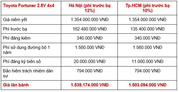 Ngoài giá bán, khi mua xe, bạn cũng cần tính đến phí đăng ký biển số. Tại Hà Nội là 20 triệu đồng, trong khi TP. HCM là 11 triệu và 1 triệu đồng cho các tỉnh thành khác. Bên cạnh việc giá trị cao, Fortuner còn được biết đến với độ bền bỉ và khả năng vận hành ấn tượng, là lý do khiến nhiều người tiêu dùng lựa chọn.